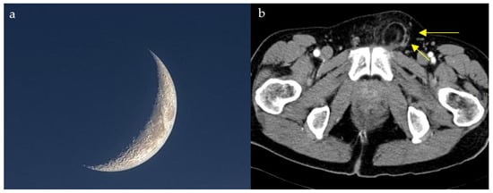 Distinguishing direct and indirect inguinal hernias on CT scan can be challenging due to the intricate anatomy at the level of the inguinal area. The lateral crescent sign is seen in the setting of direct hernias and is, therefore, helpful for making this distinction. Direct inguinal hernias project through the Hesselbach triangle, an area bordered by the lateral edge of the rectus muscle medially, the inguinal ligament inferiorly, and the inferior epigastric vessels laterally. The compression of the inguinal canal content as well as fat gives the appearance of a characteristic flattened crescent shaped structure resembling a crescent moon (Figure 13a,b) []. In a small comparative CT series, the lateral crescent sign identified direct inguinal hernias, with a sensitivity of 69% and a specificity of 80%, supporting its utility while underscoring the need for validation in larger cohorts []. Patients with groin swelling, pain, or symptoms of bowel obstruction may show a lateral crescent of compressed tissue adjacent to a direct inguinal hernia on CT. This finding distinguishes direct from indirect hernias, guiding appropriate surgical repair.