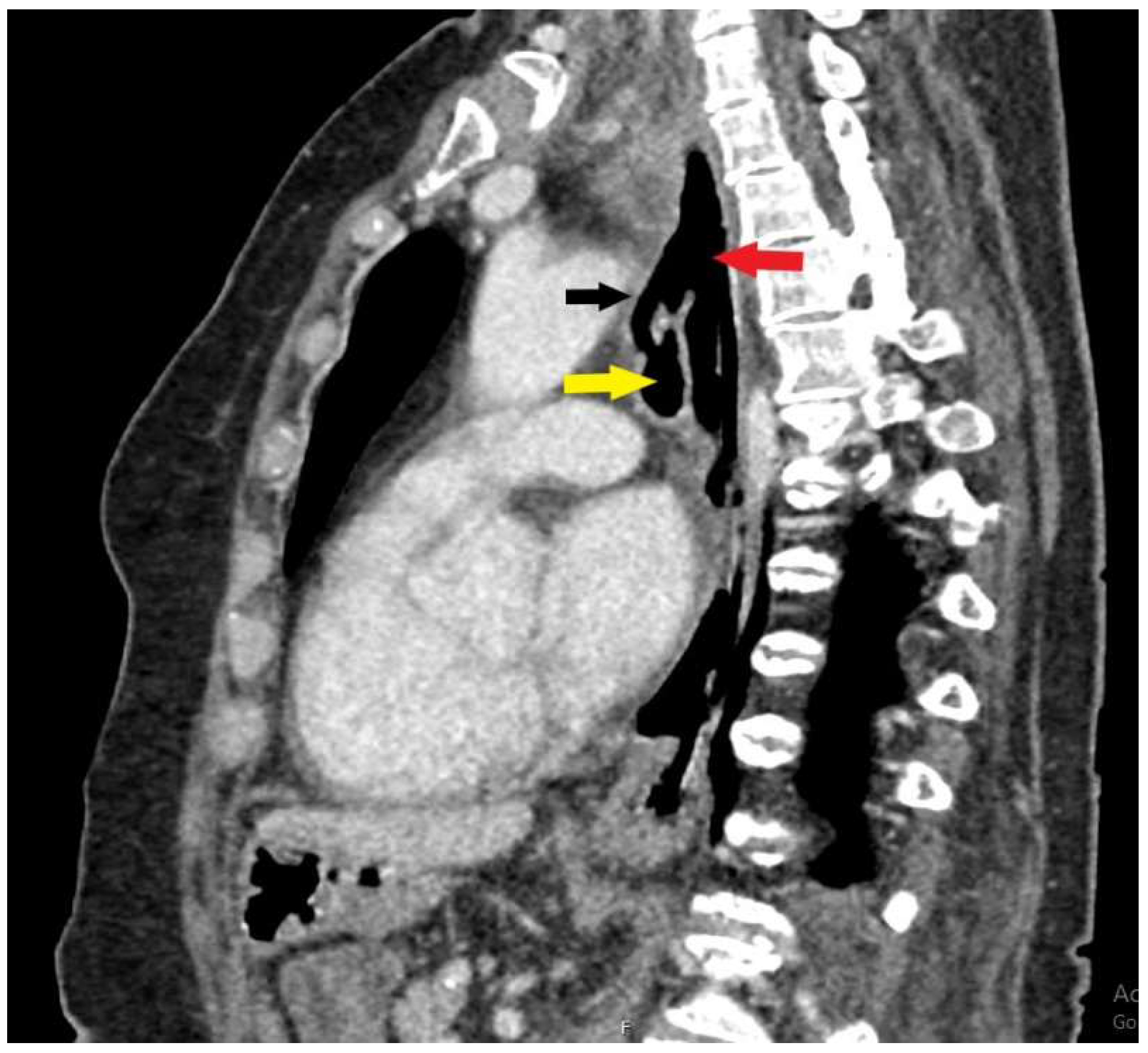 A sagittal CT scan shows interluminal communication (black arrow) between the lumen of the esophagus (red arrow) and the trachea (yellow arrow). There were also signs of aspiration pneumonia bilaterally and segmental pulmonary artery embolism (