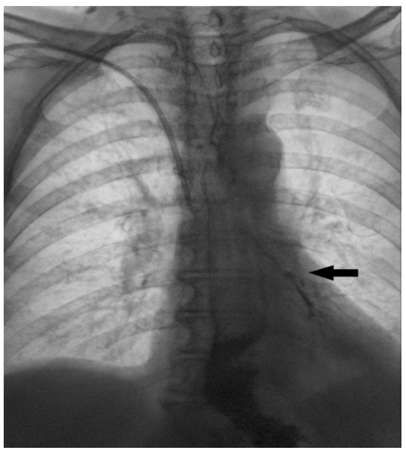 Contrast radiography is a very useful method in terms of establishing this diagnosis. The appearance of contrast in the lumen of the tracheobronchial tree (black arrow) is a direct sign of the fistulization of these structures within the esophagus. This image shows a clear esophagobronchial leak (fistula), which initiated a pronounced cough during the patient’s examination. Tracheobronchoscopy was also performed, showing an opening on the left side of tracheal bifurcation. In the further course of treatment, percutaneous endoscopic gastrostomy (PEG) was performed, and feeding via PEG was initiated. The patient responded well to antibiotics treatment, and was extubated 7 days after the admission to the intensive care unit. Surgery usually represents the primary treatment modality for acquired TEF. However, when surgery is contraindicated or cannot be performed as a primary solution, non-surgical treatment options may be explored. These can serve as a bridge to definitive surgical repair or, in cases of smaller fistulas, may even offer a definitive therapeutic option [