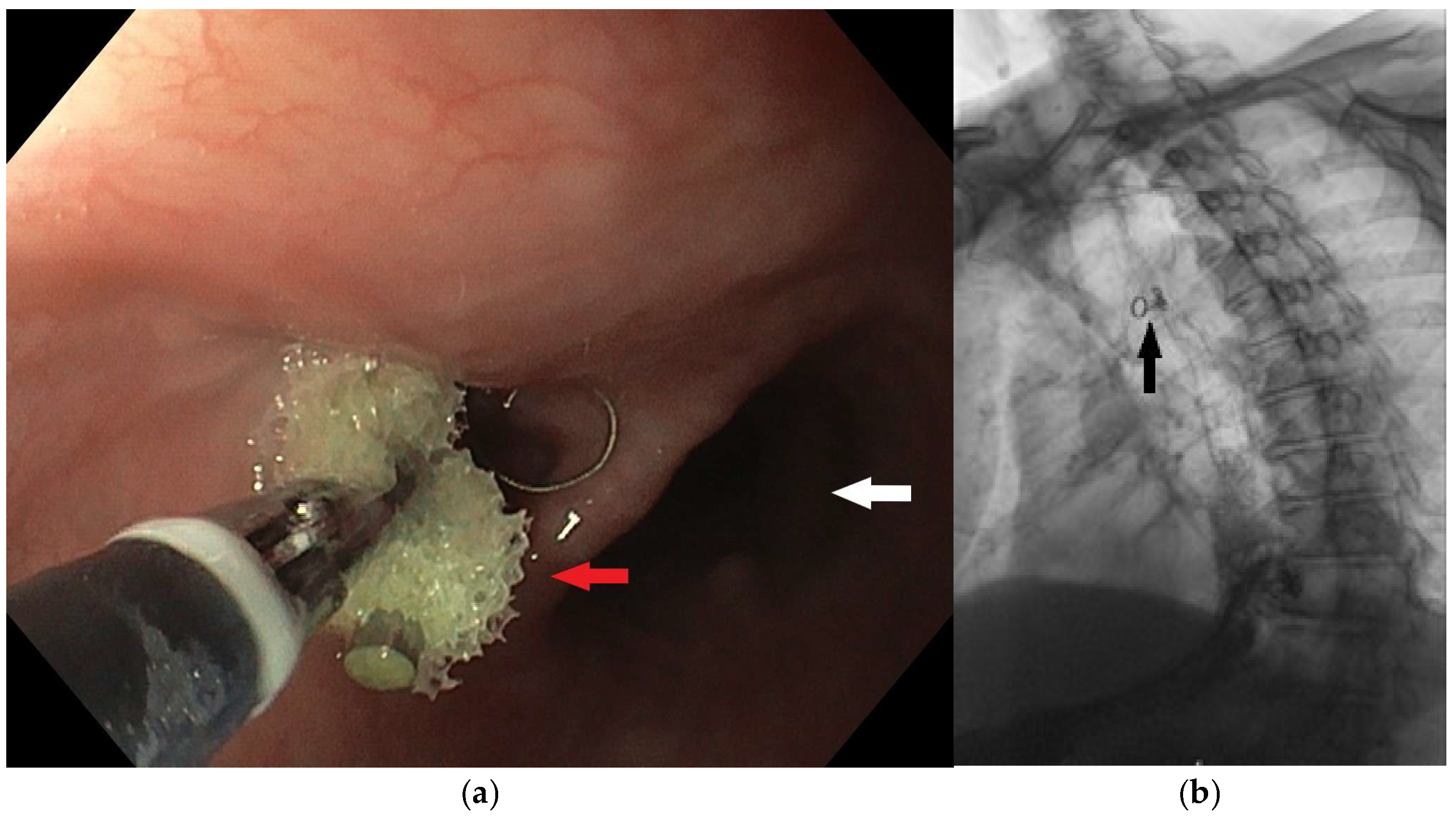 - Silon, B.; Siddiqui, A.A.; Taylor, L.J.; Arastu, S.; Soomro, A.; Adler, D.G. Endoscopic Management of Esophagorespiratory Fistulas: A Multicenter Retrospective Study of Techniques and Outcomes. Dig. Dis. Sci. 2017, 62, 424–431. [Google Scholar] [CrossRef] [PubMed]