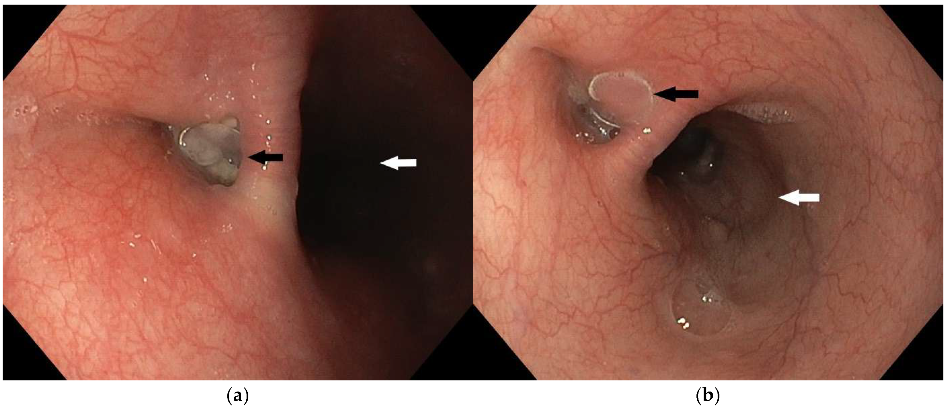 In further monitoring the patient’s condition and implementation of the placed coil (black arrows), gradual signs of epithelialization were observed. On the fifth day (a) and the fourteenth day (b) after the procedure endoscopic check/up was performed, an acceptable position of the coil (black arrow) and fistula closure were revealed. The lumen of the esophagus is indicated by a white arrow.