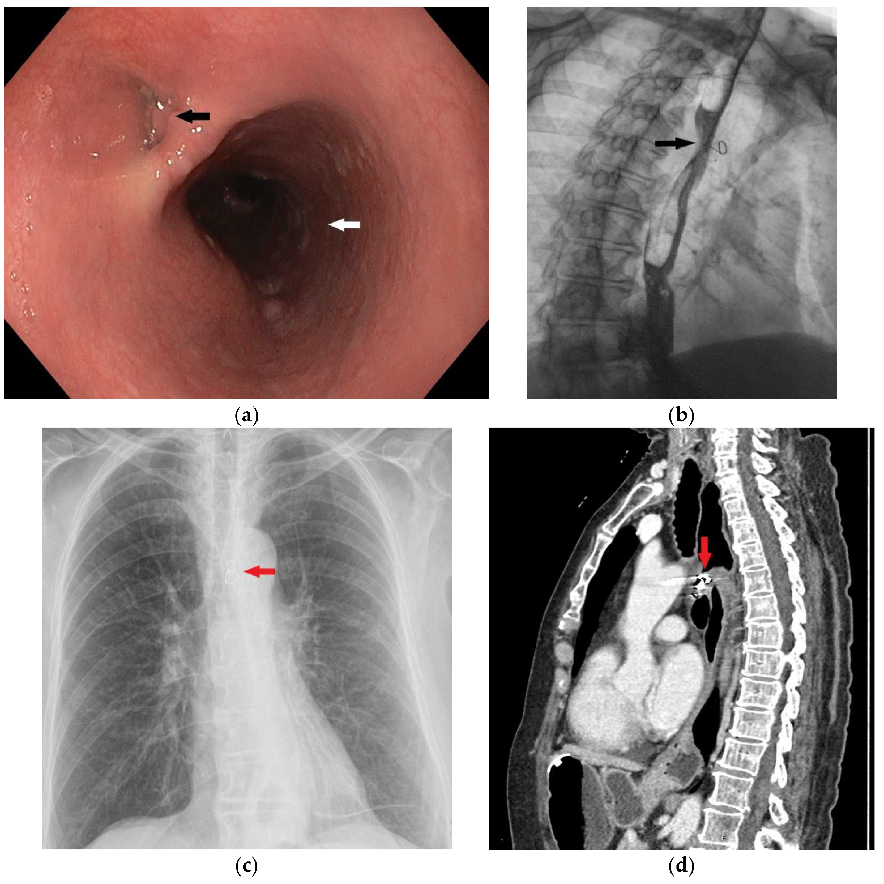 - Yata, S.; Kaminou, T.; Hashimoto, M.; Ohuchi, Y.; Sugiura, K.; Adachi, A.; Kawai, T.; Endo, M.; Takasugi, S.; Yamamoto, S.; et al. Successful closure of intractable tracheoesophageal fistula using a combination of a modified silicon stent and metallic stents. Acta Radiol. Short Rep. 2012, 19, 1. [Google Scholar] [CrossRef] [PubMed]