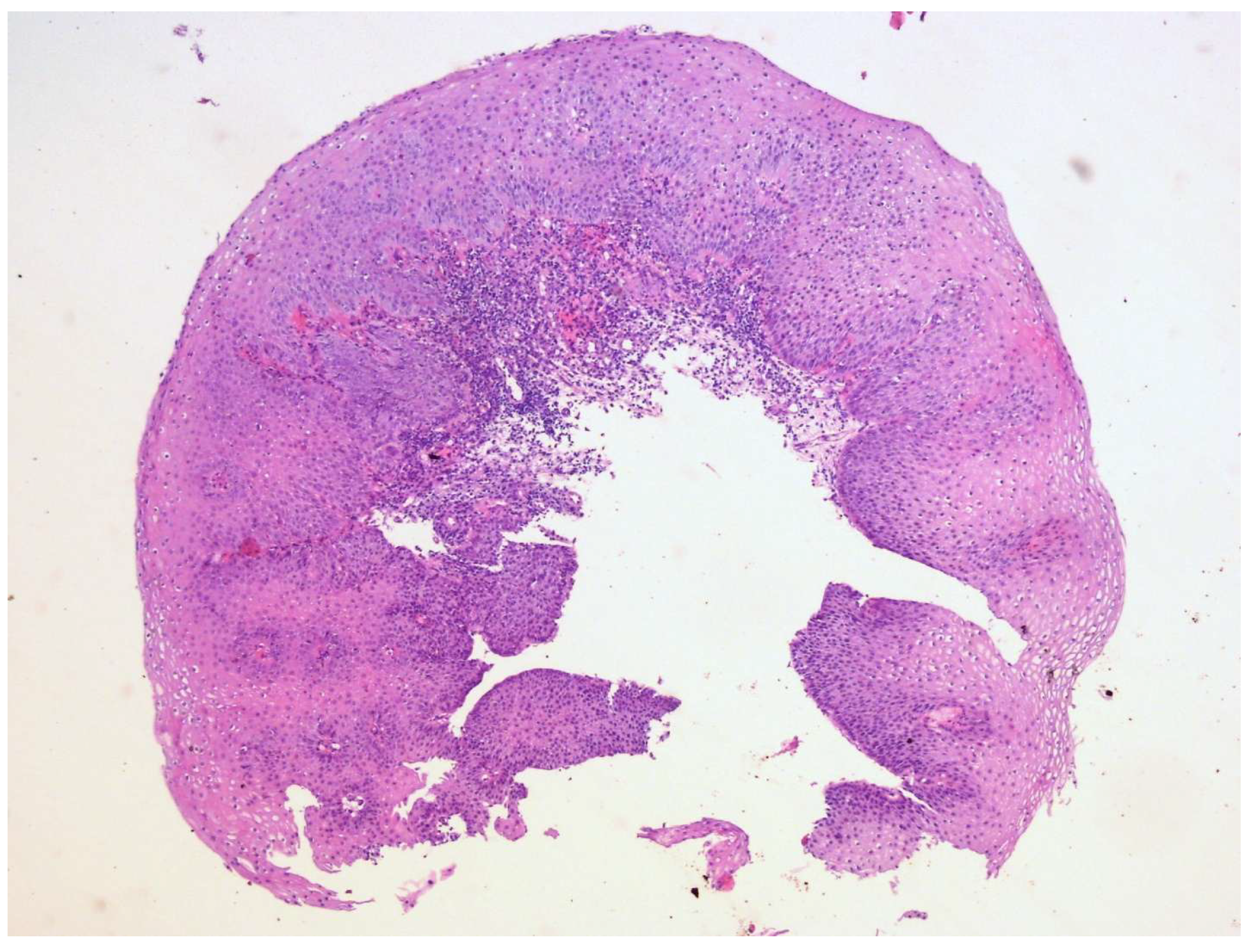 During control endoscopy, biopsies were taken from the tissue covering the coil itself. A regenerative zone of the mucosa was observed with reactive changes in the squamous cell epithelium, and another sample showed remnants of granulation tissue (HE, magnification 10×). The patient was discharged one month after the coil placement, in good general condition, with normal peroral feeding. No symptoms or complications related to the fistula were present at the moment of discharge from the hospital. In conclusion, the management of TEF requires prompt intervention to prevent serious complications that this condition carries along. Surgical repair remains the gold standard and is often the most effective treatment, particularly for larger or complex fistulas. However, in cases where surgery is contraindicated or not feasible, a variety of non-surgical options, including stenting, endoscopic techniques, tissue adhesives, and occluding devices are available. Given the limitations and variable success rates of these alternatives, treatment should be carefully individualized based on patients’ clinical condition, fistula characteristics, and overall prognosis.