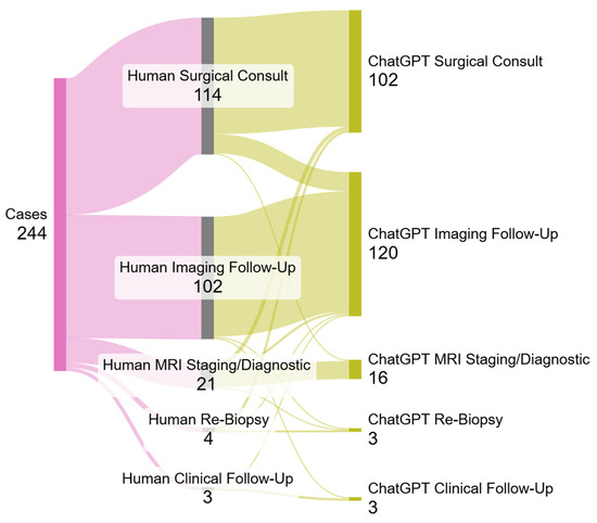 N = 16). This was followed by cases where the radiologist recommended staging/diagnostic MRI and ChatGPT-4o recommended surgical consult (