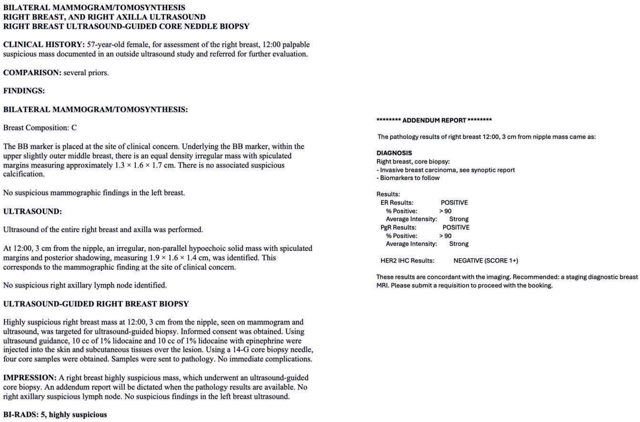 B) The radiologist’s addendum report for the same patient. The inclusion criteria were women who had undergone image-guided breast biopsies under ultrasound, stereotactic/tomosynthesis, or MRI with complete reports. Complete reports must include the radiology report, pathology report, radiology–pathology concordance, and radiologist’s management recommendations after radiologic–pathologic concordance. Patients with incomplete records, including those without a descriptive radiology report describing the pre-biopsy breast lesion, were excluded from the study. Male cases were also excluded to prevent re-identification, given their low prevalence. Other exclusion criteria include non-breast biopsies performed, such as axillary lymph node biopsies/fine-needle aspirations and cases that were lost to two-year follow-up. Additionally, cases that were biopsied benign but had concurrent ipsilateral breast cancer and underwent mastectomy were also excluded from the study, because it was not possible to correlate the biopsied lesions with the final surgical pathology on mastectomy (