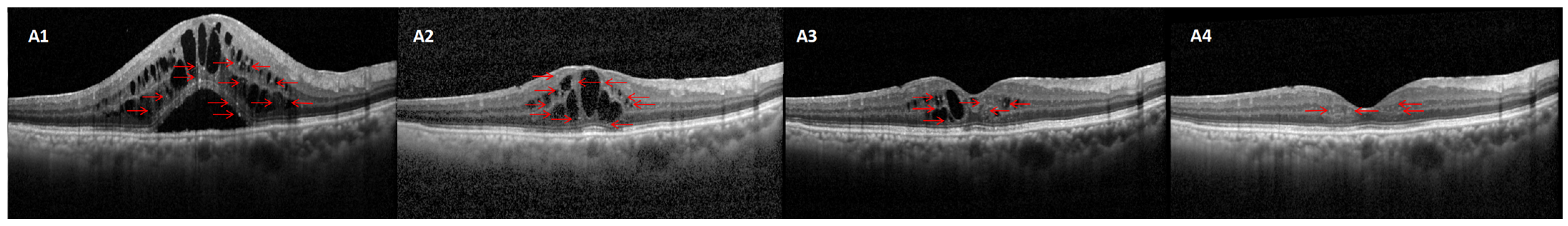 - Chen, N.N.; Chen, W.D.; Lai, C.H.; Kuo, C.N.; Chen, C.L.; Huang, J.C.; Wu, P.C.; Wu, P.L.; Chen, C.Y. Optical Coherence Tomographic Patterns as Predictors of Structural Outcome After Intravitreal Ranibizumab in Diabetic Macula Edema. Clin. Ophthalmol. 2020, 14, 4023–4030. [Google Scholar] [CrossRef]