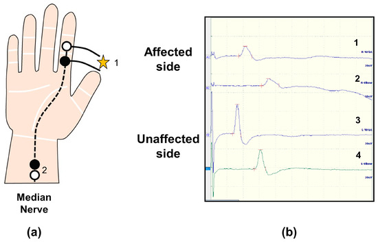 Typical findings of sensory nerve conduction study in CTS patients. (a) Electrode settings. 1: stimulating electrode, 2: recording electrode, black circle: active electrode, white circle: reference electrode, (b) Sensory nerve action potentials. 1: affected-side distal, 2: affected-side proximal, 3: unaffected-side distal, 4: unaffected-side proximal. Delayed latency and decreased amplitude of action potentials were observed on the affected side.