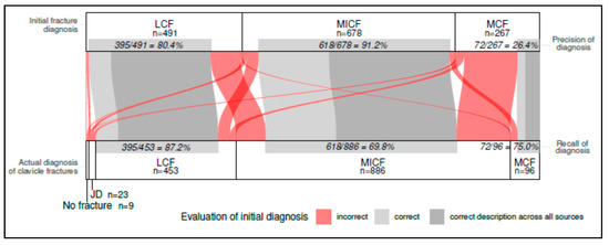 Figure 1. A comparison of the Initial Fracture Diagnosis according to the ICD 10 coding versus Corrected Coding and Actual Diagnosis of all Clavicle Fractures in a Sankey diagram. The precision rate and the recall rate of the respective diagnosis are presented. More than one option could be mentioned. The amount of completely correct descriptions across all sources is presented as well as the evaluation of correct vs. incorrect evaluated initial diagnosis. The data are presented in total numbers (n) and as percentage. MCF = medial clavicle fracture; MICF = midshaft clavicle fracture; LCF = lateral clavicle fracture; JD = joint dislocation (including sternoclavicular and acromioclavicular).