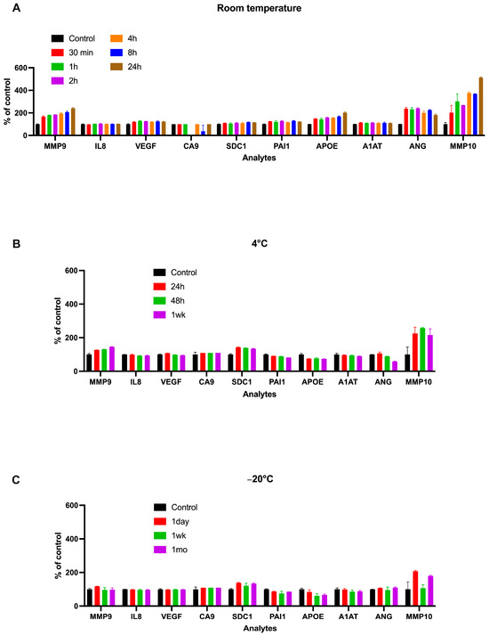 Effect of storage temperature and time on 10 bladder cancer biomarker levels in human urine specimens. Concordant evaluation of 10 urinary analytes from the Oncuria bladder cancer assay in pooled urine stored at room temperature (A), 4 °C (B), and −20 °C (C). Urine samples kept at room temperature increased the assayed levels of MMP9, APOE, ANG, and MMP10 over time. The results suggest that keeping the sample in an uncontrolled temperature causes unreliable test results. Error bars indicate the standard deviation of the mean.