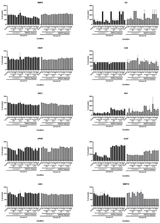 Effect of commercial preservative formulations on 10 bladder cancer biomarker levels in human urine specimens. The addition of neither cOmplete™ Protease Inhibitor Cocktail nor the urine stabilizer provided in the Alere NMP22 Urine Collection Kit prevented changes in Oncuria-measured levels of the 10 urinary analytes in urine, such as decreased levels of analytes including MMP9, SDC1,APOE, A1AT, ANG, and MMP10 when samples from two individuals were stored at room temperature or at 4 °C for up to 24 h. In addition, the NMP22 stabilizer increased the levels of IL8, PAI1, and A1AT. The results suggest that these preservatives did not stabilize some analytes but reduced the accuracy of this assay. Error bars indicate the standard deviation of the mean.