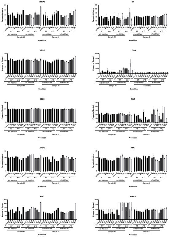 In this study, we first evaluated the effect of the storage temperature on the Oncuria’s test results. In study 1, we employed pooled urine samples from healthy volunteers. The results demonstrate that the storage of the urine samples at room temperature for >120 min significantly increased the levels of MMP9, APOE, ANG, and MMP10 (Figure 1A), which could change the final results (positive or negative to cancer). The diagnostic results from the sample stored in an uncontrolled temperature can be misleading when they are incorrect or false, which can lead to misguided treatments and harm patients. On the other hand, urine samples stored at 4 °C and −20 °C demonstrated no significant changes, suggesting that refrigeration and freezing stabilize urine samples (Figure 1B,C). As noted above, when the analyte concentrations were incorporated into the logistic regression algorithm associated with this test, there were no clinically significant changes in the algorithm output. Though encouraging, significant concern arises with the changes in analyte concentrations at room temperature. Therefore, while exercising extreme caution, we are advocating for storing Oncuria urine samples at 4 °C.