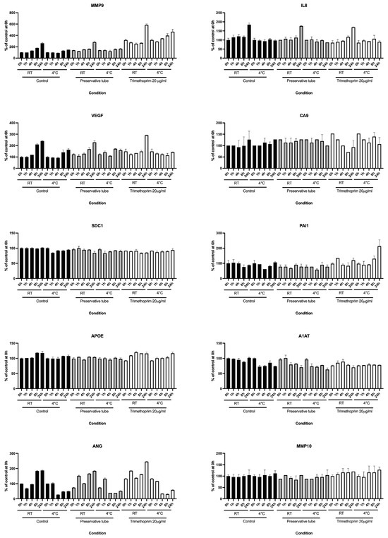 Next, we speculated that bacterial overgrowth at the time of voided urine collection could cause biospecimen instability at room temperature. Therefore, we tested the effect of trimethoprim, an antifolate antibiotic often used to treat urinary tract infections, on the stability of Oncuria analytes under various storage conditions (Figure 4). The addition of trimethoprim to urine samples did not appear to uniformly improve consistency in a subsequent analyte measurement in specimens stored at room temperature and at 4 °C for up to 24 h.