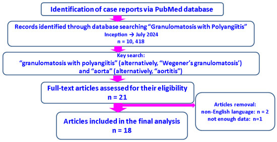 In addition to the presentation of the case-associated clinical, laboratory, imaging, and histological analyses, we provided in Discussion Section a review of the literature with concern to this specific topic. Specifically, we performed a PubMed-based, English literature search from Inception until July 2024 by using the key terms “granulomatosis with polyangiitis” (alternatively, “Wegener’s granulomatosis’”) and “aorta” (alternatively, “aortitis”) in different combinations. We selected original reports that met both of the following criteria: clinical case confirmed with ANCA-positive GPA (or GPA confirmed based on highly specific histological features) in addition to the identification of an aortic involvement that had been demonstrated by imaging and/or pathological exams and assessed as being part of the GPA-related picture. We identified 21 such cases and among them, two non-English publications and another without detailed clinical information were excluded, hence resulting in 18 similar reports [46,47,48,49,50,51,52,53,54,55,56,57,58,59,60,61,62,63] prior to this vignette on point (Figure 1).