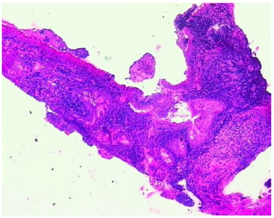Histological examination (hematoxylin–eosin) via nasal tissue biopsy after six months of treatment revealing mucinous glandular structures with preserved architecture, moderate lympho-plasmocytic inflammatory infiltrates (with diffuse distribution), moderate interstitial fibrosis, and a few dilated capillary vessels (magnification ×20).
