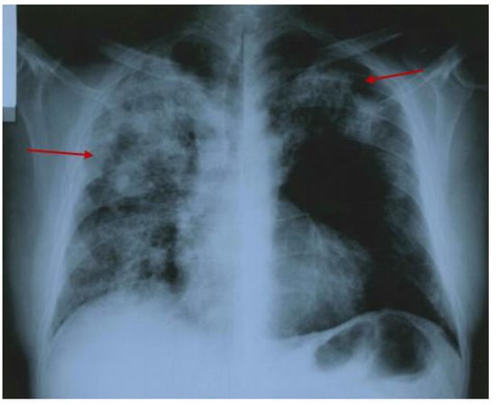 Chest X-ray showing diffuse bilateral pulmonary infiltrates (red arrow) predominantly affecting the right lung seven years after prior GPA diagnosis.