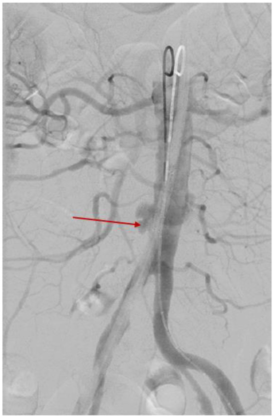 Pre-interventional arteriography showing the aortic lesion in the distal part of the abdominal aorta that formed an irregularly shaped pseudo-aneurysm (red arrow); the aorta was catheterized by placing a superstiff guidewire at this level. The procedure was followed by the implantation of 2 aortic stents of 2.4 × 4 cm.