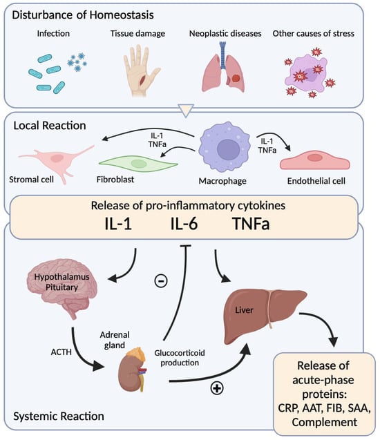 The acute response is the answer of the human body to tissue injury, cancer, immunological disorders, and infection to maintain homeostasis []. The inflammatory reaction consists of humoral, cellular, and molecular pathways [,]. In response to infection, tissue injury, or neoplasia, several cell-activation molecules and proteins are produced (Figure 1) [,]. Bacteria and viruses stimulate monocytes and macrophages, which synthesize cytokines IL-1, IL-6, and TNFa [,]. These react with hepatic receptors in hepatocytes and produce acute-phase proteins (Figure 1). IL-6 is the regulator of the acute-phase synthesis in the liver [,]. The cytokines IL-I and TNFa also stimulate endothelial cells and fibroblasts as a local reaction to inflammation. IL-6, IL-1, and TNFa control the release of ACTH from the pituitary cells of the brain. This results in the secretion of glucocorticoids by adrenocortical cells. The glucocorticoids stimulate the synthesis of acute-phase proteins and inhibit the production of cytokines [].