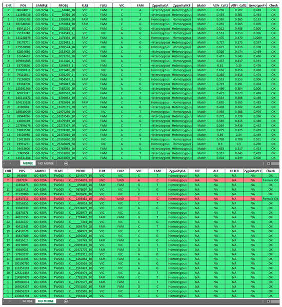 The tool filters data into two worksheets, MERGE and NO MERGE, and collects the results into a new Excel file. The MERGE worksheet contains data points with matched genotyping results between the OA and WES files, while the NO MERGE worksheet includes genotyping results from the OA panel that do not have a corresponding match in the VCF file. This is due to the nature of VCF files, which only report variants with alternative alleles, excluding homozygous wild-type (WT) calls. SNPs genotyped as homozygous WT in the OA file are included in the NO MERGE section and marked in green to indicate their expected absence in the VCF file. Discrepancies, such as mismatches in zygosity or unexpected calls, are flagged in red, highlighting SNPs requiring further verification.