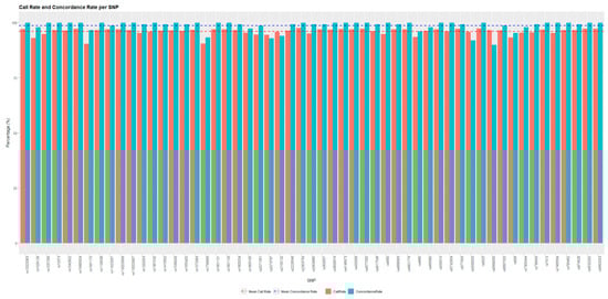 Comparison of call rate and concordance rate for each SNP. The x-axis lists the SNP IDs, while the y-axis represents the percentage values for call rate (red bars) and concordance rate (blue bars). The dashed line represents the average call rate and concordance obtained for the SNPs of interest.