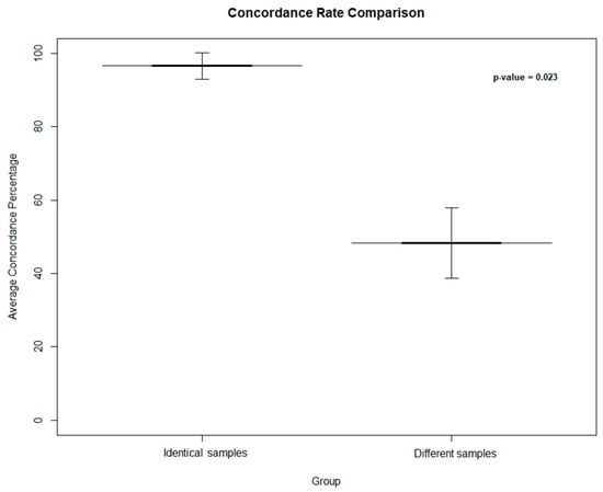 To further assess the performance of the protocol outlined in this study, a simulation was conducted on 100 additional samples by mixing the OA and WES data files related to this cohort and calculating the RMP and concordance rate. As a result, the average concordance rate was 48.31 ± 9.524% for different samples compared to that (96.63 ± 3.609%) resulting from identical samples. The difference between the concordance rates obtained from identical and different samples reported a significant p-value (p = 0.023) (Figure 4).