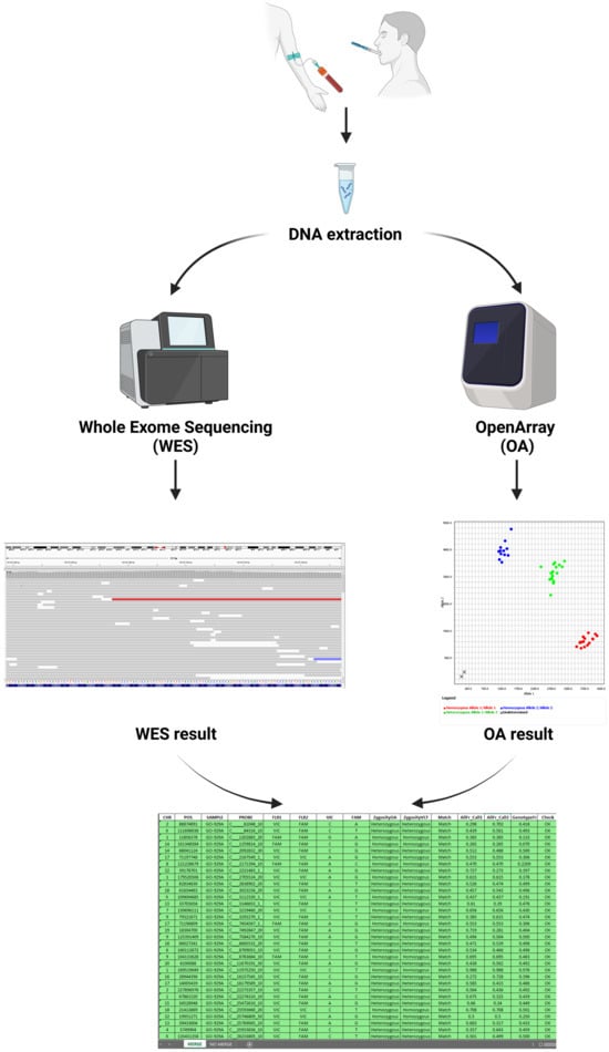 Illustration of the workflow for sample tracking. The DNA is extracted from blood samples or buccal swabs and subsequently analyzed using OpenArrayTM (OA) genotyping and next-generation sequencing (NGS). The resulting OA-generated data are compared to the NGS output data with the use of the Sample Tracking Tool in order to match the genotypes and confirm the sample identity. This figure has been created with Biorender.com (accessed on 2 January 2025).