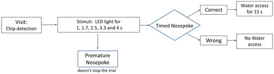 We assume that the provided experimental design can enrich the behavioral arrays employed to study animals’ cognitive profile. Time perception is the basic cognitive function that is disturbed in a different psychopathology, such as major depression and schizophrenia [2,12,60,61]; in neurodegenerative diseases, such as Parkinson’s disease [2,62,63,64]; and in neurodevelopmental disorders, such as ASD [65] and ADHD [66]. It can be implicated in impulsive behavior, in changes in the elderly [67], and under stress [40,68,69]. Thus, introduced in the current study, the animal-friendly and resource-efficient experimental protocol to examine interval timing might have great potential for application to a wide range of fundamental and practical problems. It has potential to monitor the dynamics of the treatment effect and characterize the different animal models of psychopathology.