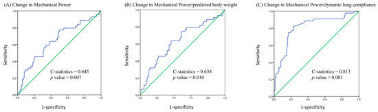 Mechanical power is typically calculated using a complex formula with several parameters, including plateau (peak) pressure, PEEP, tidal volume, and respiratory rate [3]. However, the order of importance for these parameters remains unclear [27,28]. Costa et al. considered only driving pressure and respiratory rate as independent predictive factors for survival [27]. In our previous study, we observed that changes in peak airway pressure and dynamic driving pressure before and after prone positioning were significantly correlated with survival [29]. This finding suggests that peak airway pressure or driving pressure is the most crucial MP parameter influencing improved survival in patients. However, in this study, the C-statistics for the change in dynamic driving pressure and survival and the change in MP/compliance and survival were 0.729 and 0.813, respectively, indicating that MP/compliance is a superior predictor of survival in patients with ARDS.