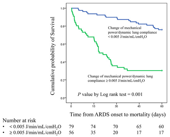 We used a receiver operating characteristic curve to analyze the 28-day mortality predictive value of changes in MP, MP/PBW, and MP/compliance after prone positioning. The C-statistics for the changes in MP, MP/PBW, and MP/compliance were 0.645 (95% confidence interval [CI], 0.542–0.747, p = 0.007), 0.638 (95% CI, 0.535–0.741, p = 0.010), and 0.813 (95% CI, 0.730–0.896, p < 0.001), respectively (Figure 2). We also used Youden’s index to determine the optimal cutoff value for the change in MP/compliance, which was +0.005 J/min/mL/cmH2O (Youden’s index was 0.591). Patients with a change in MP/compliance of ≥0.005 J/min/mL/cmH2O had significantly higher 28-day and 60-day mortality rates than did those with a change of <0.005 J/min/mL/cmH2O (66.0% vs. 13.4%, p = 0.001; 72.0% vs. 26.8%, p = 0.001). The Kaplan–Meier curve is presented in Figure 3.