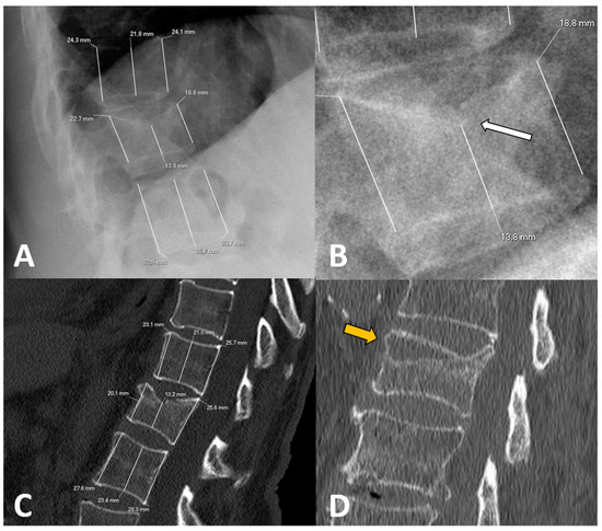 Examples of radiological variables assessed in our sample, from a 58-year-old woman (A–C) and an 88-year-old man (D). Patient 1. X-rays ((A), magnified in (B)) and CT at diagnosis (C). The height of each wall (anterior, middle and posterior) was measured through lines parallel to the anterior vertebral walls. Relative measurements were obtained for each fractured vertebral body by dividing them between the mean of the respective measurements in the cephalad and caudal vertebral bodies. Note that some cases involved subtle findings such as the asymmetric, focal endplate depression depicted with a white arrow in (B). Patient 2. CT at diagnosis (D) showing an obvious subchondral defect (orange arrow) consistent with a large intravertebral cleft.
