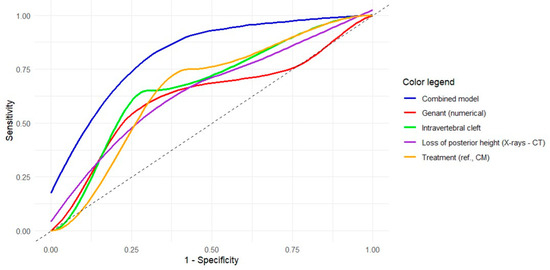 The results of the ROC curve analyses for each of the significant models are shown in Table 5 and represented in Figure 3. For the variable “loss of posterior height (X-rays–CT)”, the optimal cutoff of 0.240 (Youden index = 0.328) showed a sensitivity of 60% and a specificity of 72.9% to predict MFs. Supplementary Table S5 and Supplementary Figure S1 show the same analyses and graphical representation for the subgroup of patients with OVFs located at the thoracolumbar junction. For the variable “loss of posterior height (CT)”, the optimal cutoff of 0.161 (Youden index = 0.447) showed a high sensitivity (92.9%) but a low specificity (51.9%) to predict MFs.