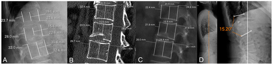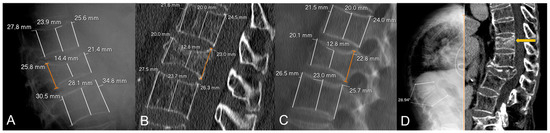 Illustrative example of a patient without metachronous fractures in our sample. (A) Initial X-rays. (B) Initial CT (MPR set at 1 mm). (C) Initial CT (MPR set at 100 mm for easier comparison with measurements on X-rays). (D) Follow-up X-rays. This is a 77-year-old woman with a biconcave, grade 1 (Genant’s classification), OF2 (DGOU’s classification) fracture of L1. The loss of posterior vertebral height (PVH) on CT was negative and the difference in loss of PVH was close to 0 (0.1%). She was treated with vertebroplasty (note a slight cement leak at T12-L1 intervertebral disc) and developed no metachronous fractures. In addition, follow-up X-rays 3 years later showed low-to-moderate local kyphosis (monosegmental Cobb angle of 15°) with preservation of sagittal balance (orange vertical line in (D)).