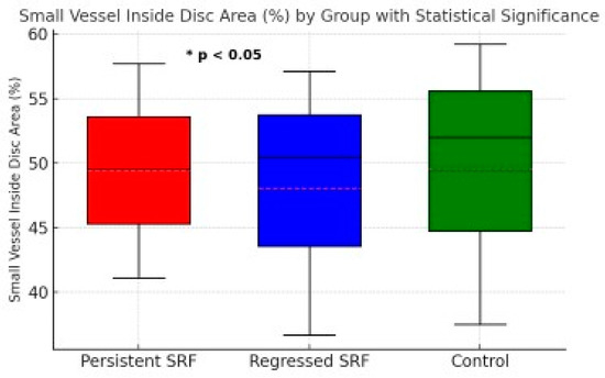 Small vessel inside disc area (%) for persistent SRF, regressed SRF, and control groups. Boxplot shows the median, interquartile range, and minimum/maximum values for each group. A statistically significant difference (* p < 0.05) was observed between the persistent SRF and regressed SRF groups.
