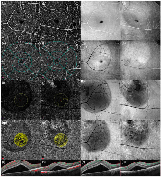 Optical Coherence Tomography Angiography (OCTA) images and corresponding optical coherence tomography (OCT) scans of two male patients with central serous chorioretinopathy (CSCR). The first and third columns (c,g,k,o) represent images from a 48-year-old male patient with peripapillary involvement, while the second and fourth columns (d,h,l,p) represent a 46-year-old male patient without peripapillary involvement. (a,b) Enface OCTA images highlighting the vascular structures of the macular region in both patients. (e,f) OCTA images showing the vascular density distribution in the central macular region, emphasizing differences between patients with and without peripapillary involvement. (i,j) Vascular perfusion maps focusing on the central macular area, showing localized reductions in vascular density in the patient with peripapillary involvement. (m,n) Color-coded maps of radial peripapillary capillary (RPC) vessel density, illustrating microvascular differences between the two cases. (r,s) Cross-sectional OCTA scans showing structural and vascular characteristics near the optic nerve head. (t,u) OCT cross-sectional scans displaying the retinal layer thickness and subretinal fluid accumulation in the two patients, highlighting the structural differences in the presence and absence of peripapillary involvement.