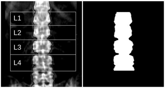 The left panel displays a DXA image with ROIs defined by the equipment’s software, and the right panel shows the corresponding automatically generated mask. In the left figure, the lateral contour is delineated by black pixels, while white lines individually divide the four vertebrae of interest.