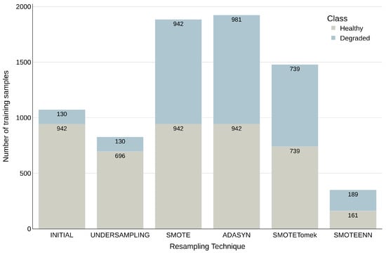 The initial dataset exhibited a pronounced imbalance in the number of samples between the two target classes, a common challenge in clinical datasets that can significantly impair the performance and generalisation capacity of machine learning models. Initial experiments using this imbalanced dataset demonstrated suboptimal results, underscoring the necessity of mitigating this issue. Several resampling techniques were applied specifically to the training set to mitigate this imbalance and improve predictive accuracy, which initially comprised 1071 samples (942 healthy and 129 degraded). By resampling the class distribution within the training set, the aim was to ensure a more equitable representation of both classes during model training.