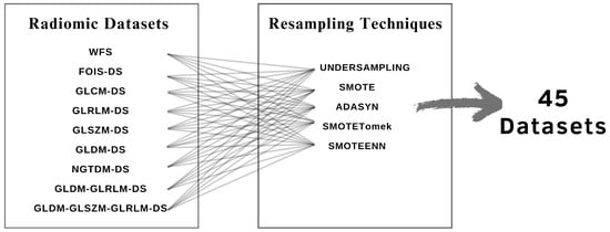 Application of five resampling techniques to each radiomic dataset results in 45 new, more balanced datasets.