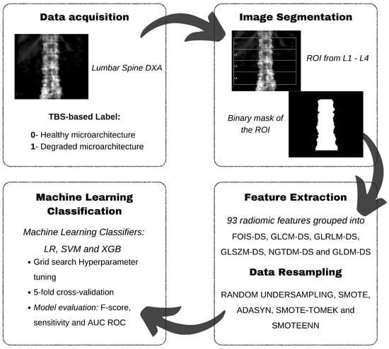 - Abdala, R.; Gonzalez, M.; Zanchetta, M.B.; Longobardi, V.; Sesta, M.; Massa, J.M. Classification of DXA Samples Into TBS Ranges Using Machine Learning and Pyradiomics. In Proceedings of the Annual Meeting of the American Society for Bone and Mineral Research, Austin, TX, USA, 9–12 September 2022. [Google Scholar]