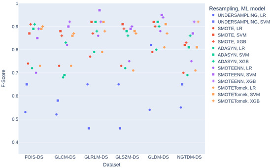 Furthermore, Figure 5 shows the classification results for all classifiers and individual feature collections, comparing the obtained F-score metric. To improve visualisation, the points for each dataset are separated to avoid overlap, as some combinations share identical F-score values. In the case of classification results obtained with XGB using datasets processed with the UNDERSAMPLING technique, all F-score values were below 0.25 and were therefore excluded from the figure. The figure highlights that certain feature sets, such as GLRLM-DS and GLDM-DS, demonstrate the best overall performance.