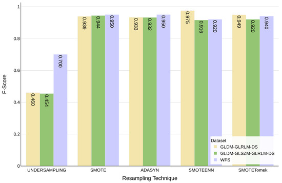 Furthermore, as shown in Figure 6, the combined datasets with specific resampling techniques yielded high F-score: 0.950 for WFS and ADASYN, 0.975 for GLDM-GLRLM-DSand SMOTEENN, and 0.944 for GLDM-GLSZM-GLRLM-DS and SMOTE. In these cases, SVM was the best-performing classifier.