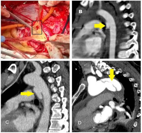 Traumatic (Figure 1A–D) and iatrogenic (Figure 2A–D) aortic diseases, on the other hand, affect all age groups and require heightened clinical awareness [14,15]. Traffic accidents, which account for over one million deaths annually, according to World Health Organization (WHO) data, contribute significantly to traumatic aortic injury. Notably, one-fifth of these fatalities result from traumatic aortic injury, with the most commonly affected sites being the aortic isthmus (90%), aortic root (5%), and diaphragmatic hiatus (5%) [16,17]. Physicians should therefore maintain a high level of vigilance when evaluating patients in this context.