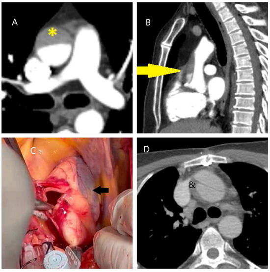 Computed tomography and operative images demonstrating iatrogenic aortic injury. (A,B) Axial (asterisk) and sagittal (yellow arrow) CT images showing dissection in the right anterolateral segment of the ascending aorta, which developed during imaging of the right coronary artery in a 50-year-old male patient with inferior myocardial infarction. (C) Angiographic image showing a hematoma in the right lateral wall of the ascending aorta (black arrow) that developed during angiography in a 60-year-old male patient. (D) CT image showing a hematoma and dissection at the aortic cannulation site (indicated by the ampersand symbol) in a 45-year-old female patient who had undergone surgery for bicuspid aortic valve one month prior to the dissection event.