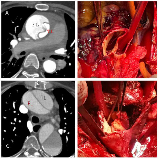 CT and operative images illustrating true lumen (TL) and false lumen (FL) in classic aortic dissection. (A,B) Images from a 48-year-old male long-haul truck driver with no known risk factors other than smoking. He was diagnosed with type A aortic dissection following severe, tearing chest pain triggered by emotional stress. In (B), the aspirator demonstrates the false lumen (FL). (C,D) Images from a 65-year-old female patient with diabetes mellitus and hypertension who was diagnosed with aortic dissection in the emergency department four days after persistent back pain radiating distally from between the scapulae. The pincette highlights the intimomedial flap, and the FL shows a thrombotic appearance (TL = true lumen; FL = false lumen).