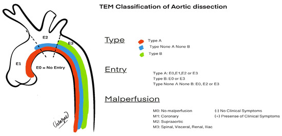 This process involves extracellular matrix disruption and elastic fiber fragmentation in the medial layer. Intimal tears typically occur in the right lateral wall of the ascending aorta or the descending segment near the left subclavian artery, areas prone to hemodynamic stress [19]. Clinically, CD typically presents with sudden and severe chest or back pain, often described by patients as “sharp and tearing”. CD has its own specific classification, and recently, the European update of the Stanford classification—the Type, Entry, and Malperfusion (TEM) classification—has been recommended for use. The full details are explained in Table 1, and the representation is shown in Figure 4 (Table 1 and Figure 4).