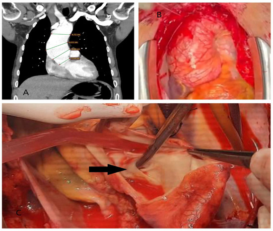 CT and operative images of incomplete dissection. A 28-year-old male farmer with a marfanoid physical appearance but no notable family history was evaluated for exertional dyspnea and diagnosed with severe aortic insufficiency. (A) Coronal CT image showing an ascending aortic aneurysm. (B) Operative image of the ascending aorta. Pay attention to the absence of findings indicative of aortic dissection in both the CT and operative images. (C) During exploration of the ascending aorta, which appeared solely as an aneurysm on imaging, a pocket-like, self-contained dissected area was identified (black arrow). Genetic testing for the patient is ongoing.