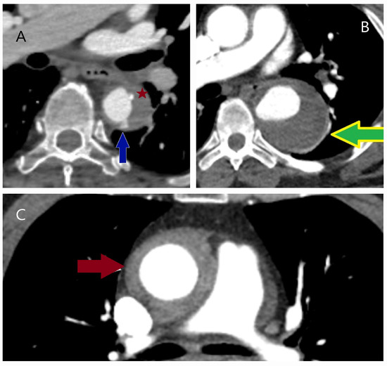 CT images of intramural hematoma and periaortitis. (A) Axial CT image of a 68-year-old patient with a history of hypertension, smoking, and coronary artery bypass grafting. The site of the intimal defect is visible (blue arrow), and intimal calcifications (typically associated with atherosclerotic risk factors) are distinguishable features (red star). (B) CT image of a 77-year-old male patient diagnosed with type B intramural hematoma detected during routine scans (green arrow) while undergoing treatment for chronic obstructive pulmonary disease. (C) CT image of a 58-year-old male patient who presented with intermittent low-grade fever and accompanying chest pain during the day. Echocardiography revealed thickening of the ascending aortic wall and an increase in diameter, prompting further evaluation with CT. The scan identified circular, non-luminal periaortic findings consistent with periaortitis. This condition, often associated with diseases such as Erdheim–Chester disease or IgG4-related vasculitis, requires further investigation to avoid misdiagnosis as intramural hematoma (red arrow).