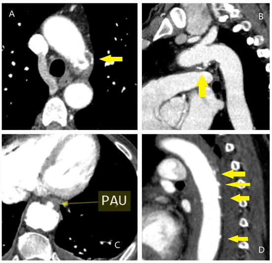 Another aortic pathology involving the intimal layer and closely associated with atherosclerosis is penetrating aortic ulcer (PAU). In this condition, the ulcer extends from the internal elastic lamina into the media and can progress to life-threatening complications, including aneurysm, dissection, or rupture [24] (Figure 7A–D).