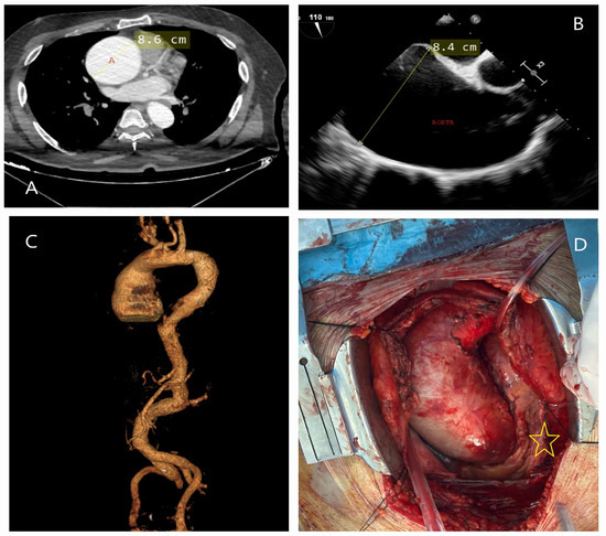 CT, TEE, and operative images of hereditary thoracic aortic aneurysm. A 58-year-old asymptomatic male patient, evaluated for screening purposes due to his brother’s history of aortic dissection, was incidentally found to have a giant ascending aortic aneurysm. (A) Axial CT image showing the aneurysm measuring 8.6 cm.; A, Ascending aorta (8.6 cm) (B) TEE performed to assess aortic valve pathology revealed a tricuspid valve with severe aortic insufficiency, and the ascending aorta measured 8.4 cm. (C) 3D CT angiography evaluating all segments of the aorta to investigate the presence of additional aneurysms. (D) Intraoperative image showing the ascending aorta expanding circularly to occupy the entire mediastinum and displacing the heart to the left (yellow star). The patient underwent a Bentall procedure, and ventricular functions improved postoperatively.