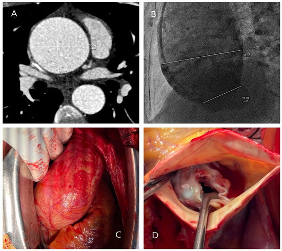 CT, aortography, and operative images of a patient with a bicuspid aortic valve causing an ascending aortic aneurysm. A 55-year-old male patient was under follow-up for known bicuspid aortic valve disease. Despite initially refusing surgery due to fear of the procedure, he decided to undergo surgery due to worsening dyspnea and decreased functional capacity in recent months. (A) Axial CT image showing the ascending aorta measuring over 50 mm. (B) Aortography confirming the diameter of the ascending aorta exceeds 50 mm. (C) Operative image showing the post-stenotic aneurysm with an enlarged aorta (in cases of root aneurysms or bulb-like aortic shapes, bicuspid aortic valve should always be investigated). (D) Intraoperative image demonstrating the calcified and fused cusps of the bicuspid aortic valve.