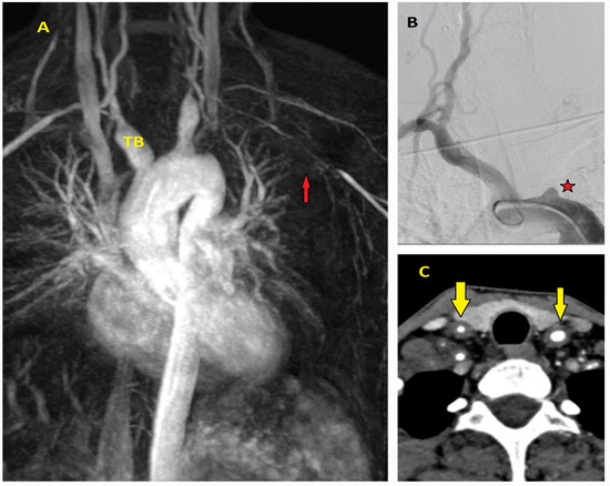 CT, MR, and angiographic imaging of Takayasu arteritis and giant cell arteritis. (A) A 28-year-old female patient presenting with symptoms of arm numbness and weakness during activity was initially evaluated for thoracic outlet syndrome and cervical discopathy. However, MR imaging revealed findings consistent with Takayasu arteritis, demonstrating long-segment caliber loss in the left subclavian and carotid arteries (red arrow; TB, Truncus Brachiocephalicus). (B) A 32-year-old male smoker presented with ischemia in the left upper extremity. Clinical history revealed frequent episodes of amaurosis fugax. Doppler ultrasonography of the carotid and upper extremities showed no detectable flow, and angiography confirmed occlusion (red star). The patient was diagnosed with Takayasu arteritis following a temporal artery biopsy. (C) A 62-year-old female patient from the Caucasus with a recent history of worsening headaches, dizziness triggered by sudden movements, persistent tinnitus, and mildly elevated D-dimer levels was initially suspected to have long COVID syndrome. However, Doppler ultrasound and subsequent CT imaging revealed fibrotic thickening of the arterial walls in both carotid arteries, with significant stenosis in the right carotid artery (yellow arrows). Temporal artery biopsy confirmed a diagnosis of giant cell arteritis.