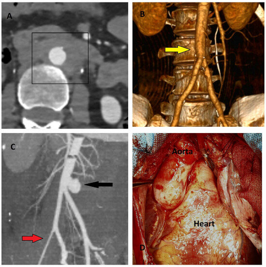 CT and surgical images of aortitis associated with immune-mediated inflammatory diseases. (A) A 58-year-old male farmer presented with weight loss and claudication. CT imaging revealed circular fibrotic tissue surrounding the abdominal aorta (black square) along with retroperitoneal fibrosis, leading to a diagnosis of Erdheim–Chester disease. (B) A 3D CT angiography of the same patient showed the aorta appearing normal, resembling that of a healthy individual (yellow arrow). These images emphasize the need for meticulous examination of CT findings, especially when evaluating aneurysms and intramural hematomas. (C) A 25-year-old male patient presented with recurrent pain in the lower right abdominal quadrant. He reported a history of frequent oral ulcers and occasional vision problems, suggestive of Behçet’s disease. Despite ongoing medication, the patient experienced persistent attacks. During his third-year follow-up, he was evaluated for claudication and was found to have a saccular aneurysm in the abdominal aorta (black arrow) and a diminutive right iliac artery (red arrow). (D) A 22-year-old male heavy smoker underwent early coronary artery bypass grafting due to acute coronary syndrome caused by a left main coronary lesion. Intraoperatively, the ascending aorta appeared small relative to his body size, irregularly shaped, and covered with a marble-white fibrous tissue. Biopsy findings confirmed a diagnosis of IgG4-related aortitis. He is currently under follow-up by the rheumatology clinic.